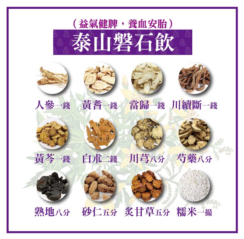 考慮臺灣地處亞熱帶氣候,以濕熱為病,保産無憂方發散或辛散藥的比例過髙,有時不太適合用,如果真的要安胎,我認為泰山磐石飲更為適合。泰山磐石飲組成人參一錢,黃耆一錢,當歸一錢,川續斷,黃芩各一錢,白朮二錢, 川芎八分,芍藥八分,熟地八分,砂仁,炙甘草各五分(5g),糯米一撮(5g),益氣健脾,養血安胎。