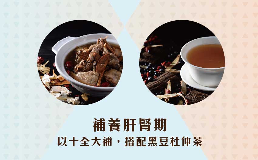 後期則以補益肝腎為主,為期10-20天左右,無論是自然產或是剖腹產的產婦,都可能會有產後腰痠的不適感。中醫古籍提到「肝主筋、腎主骨」,產後肝腎之氣較為虧虛,容易導致腰痠或是骨節痠痛。此外,由於「腎之華在髮」,大多產婦也會有產後掉髮的困擾,如果要避免這些問題,補肝血、充腎氣的調理就相當重要了。在這時候可服用十全大補湯加減牛膝、續斷,另外像是黑豆杜仲茶也可以在這個時期服用,同時搭配一些經絡伸展,除了能緩解身體痠痛以外,還可減少產後嚴重掉髮,對於有意再生產的婦女也能夠培養日後良好的孕育環境。
