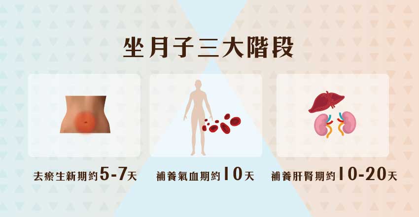 坐月子可分做三大階段來看,分別是去瘀生新期、補養氣血期以及補養肝腎期。