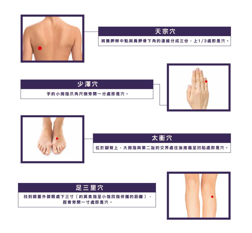 中醫認為,乳頭屬肝,乳房屬胃,脾胃的氣血是否足夠以及肝氣疏泄的順暢程度和乳汁分泌息息相關,此外小腸主液,與體內分泌的腺液包含乳汁都有關聯,因此,以下推薦幾個分別隸屬於肝、胃、小腸經的穴道,可以有效幫助乳汁分泌及通暢,建議產婦可用手指按摩正面穴道,背面穴道則可用按摩球靠著牆壁去做按壓刺激。