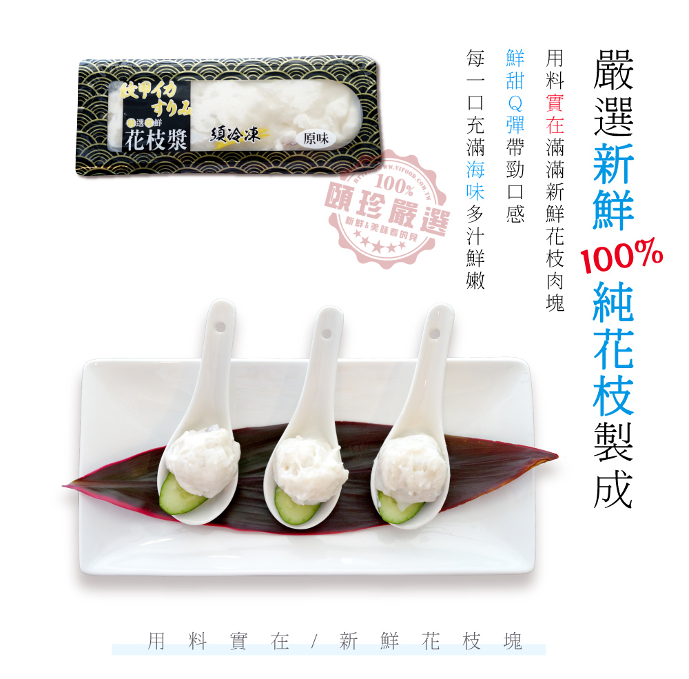 內容物成分:花枝、豬背脂(台灣)、樹薯粉、麩胺酸鈉、食鹽、胡椒