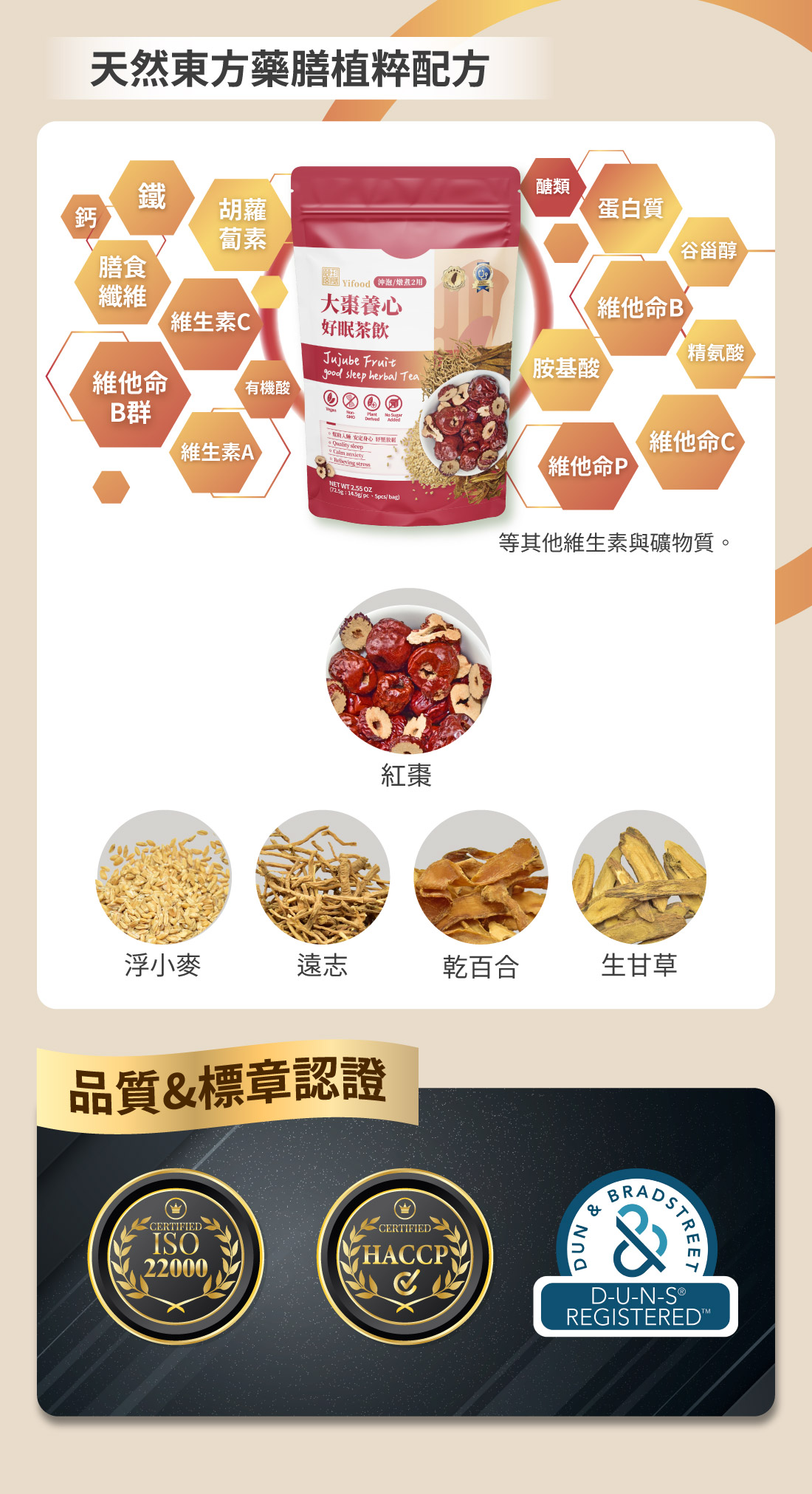 ■ 產品成份:浮小麥、紅棗、細生地 、乾百合、遠志、生甘草 (Blighted Wheat, Jujube Fruit, Rehmannia Root , Dry Lily Bulb, Polygala Root, Liquorice Root and Rhizome)