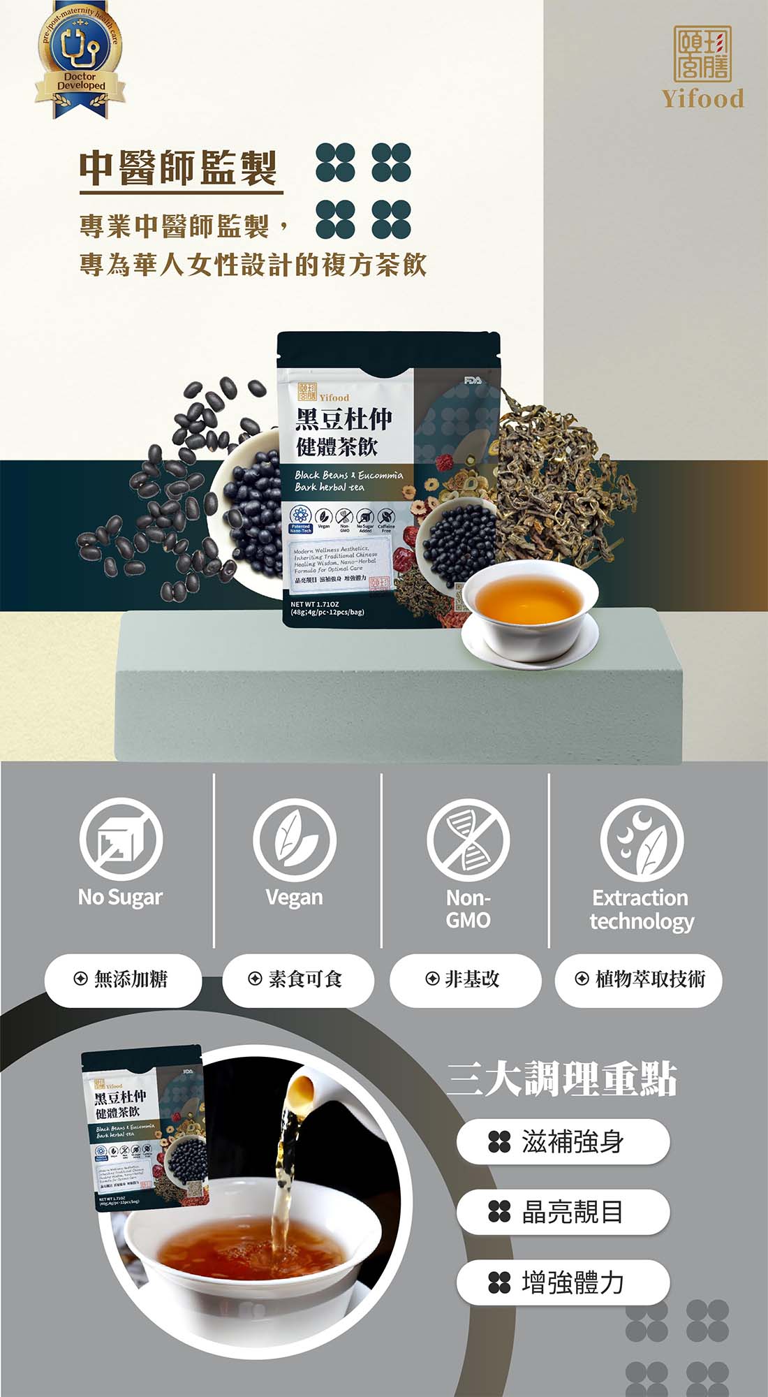 ■ 產品成份:黑豆、杜仲葉、黃耆、無花果、紅棗、枸杞 (Black soybean, eucommia leaf, Astragalus Root, Dry Common Fig, Jujube Fruit, Wolfberry Fruit)