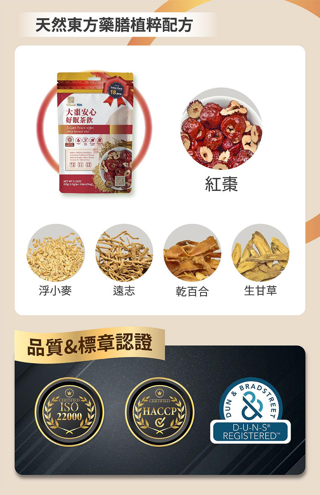 ■ 產品成份:浮小麥、紅棗、細生地 、乾百合、遠志、生甘草 (Blighted Wheat, Jujube Fruit, Rehmannia Root , Dry Lily Bulb, Polygala Root, Liquorice Root and Rhizome)