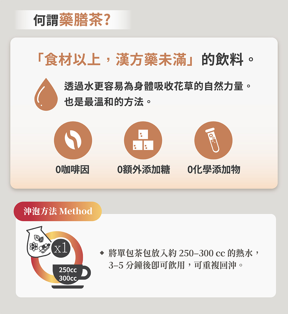 方法一 (日常保養): 打開包裝袋取出“1份茶包”,放入杯子/瓶子中,加入500cc的熱水沖泡,約莫經3-5分鐘,讓茶包充分釋放出香氣和味道後,即可飲用。
