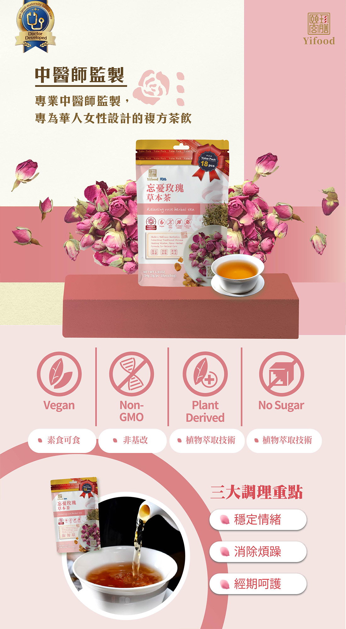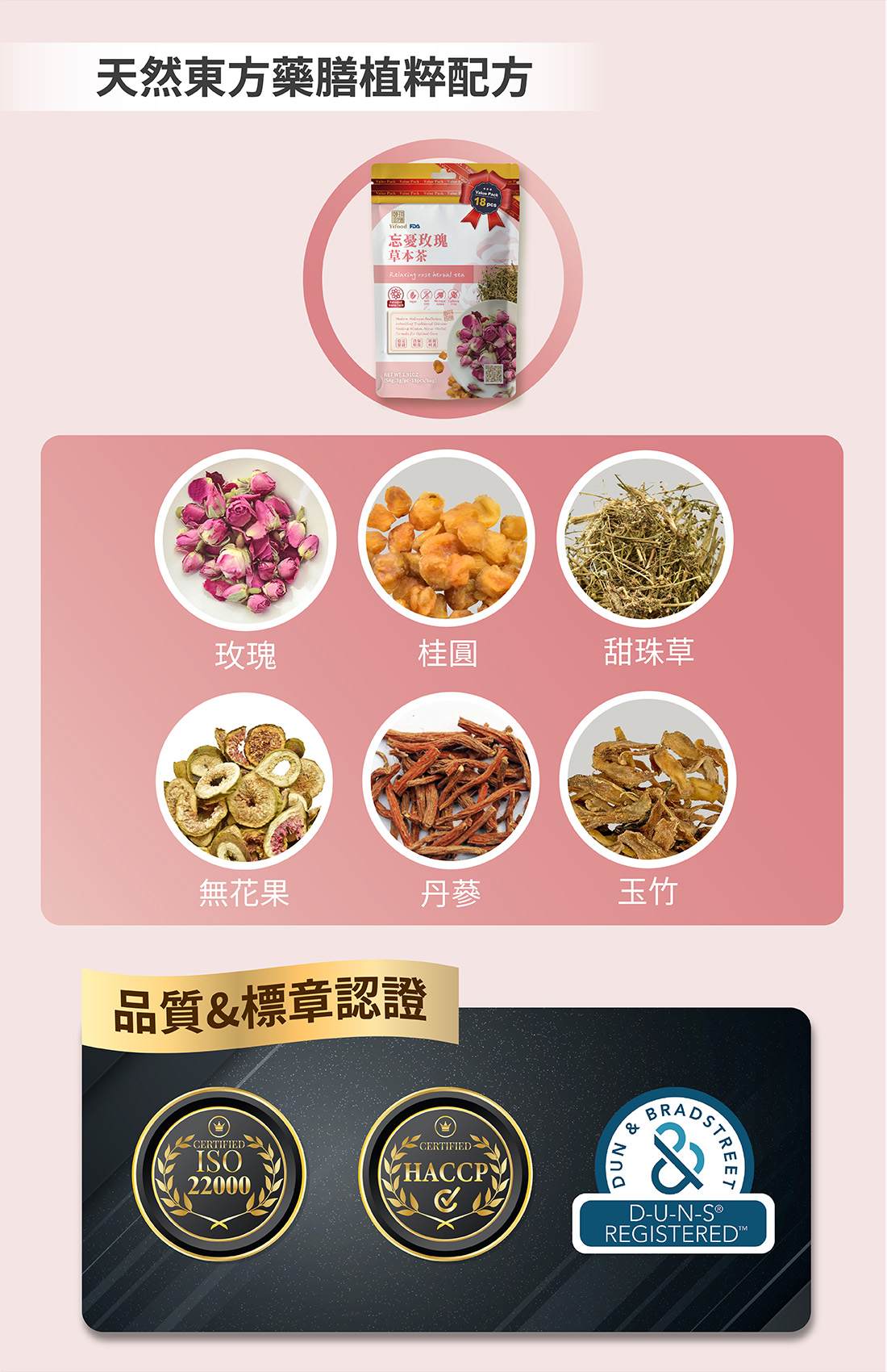 ■ 產品成份:玫瑰、玉竹、桂圓、丹蔘、甜珠草、無花果(Rose, Polygonatum odorata, Longan, Ginseng, Sweetpea, Fig)