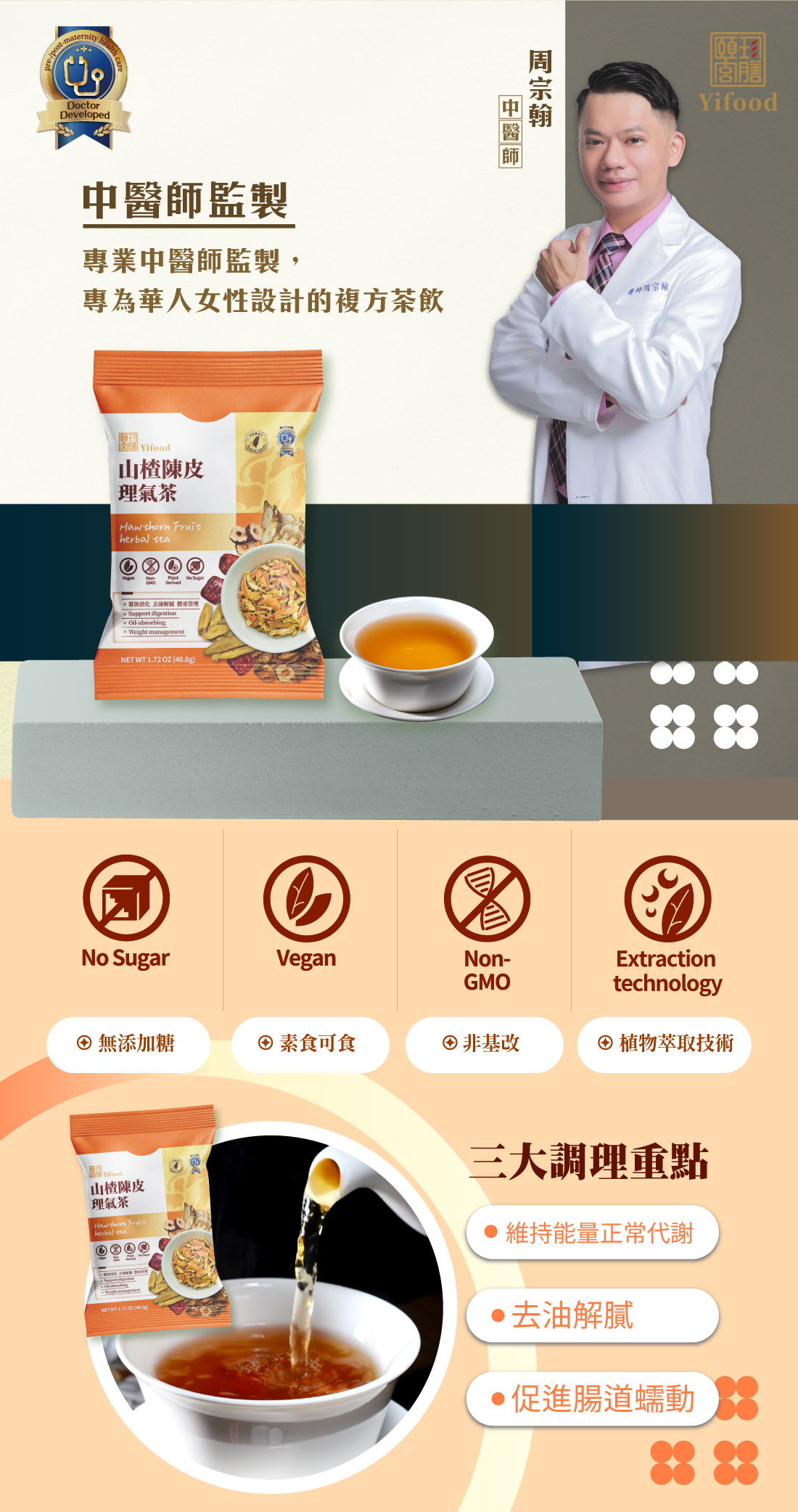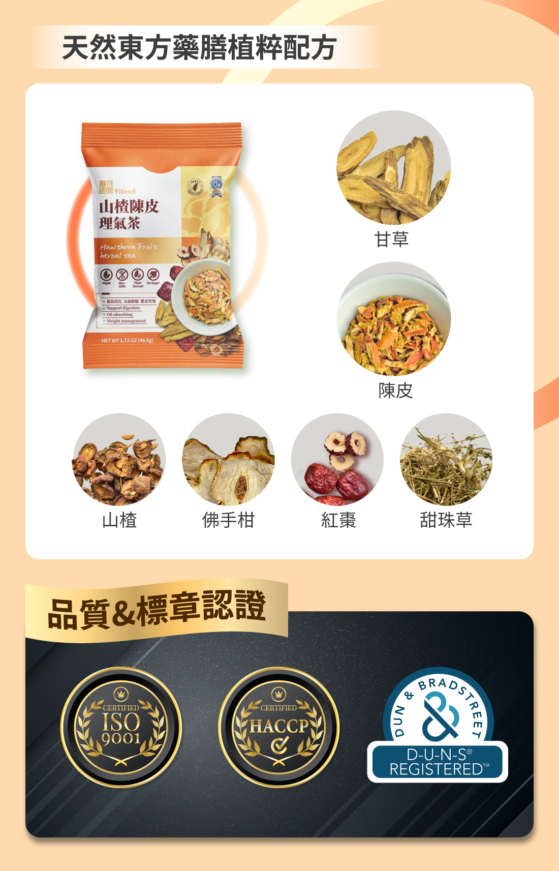 ■ 產品成份:山楂、陳皮、甘草、紅棗、佛手干、甜珠草 (Hawthorn Fruit, Aged Tangerine Peel, Liquorice Root and Rhizome, Jujube Fruit, Finger Citron, Dry Scoparia dulcis L.)